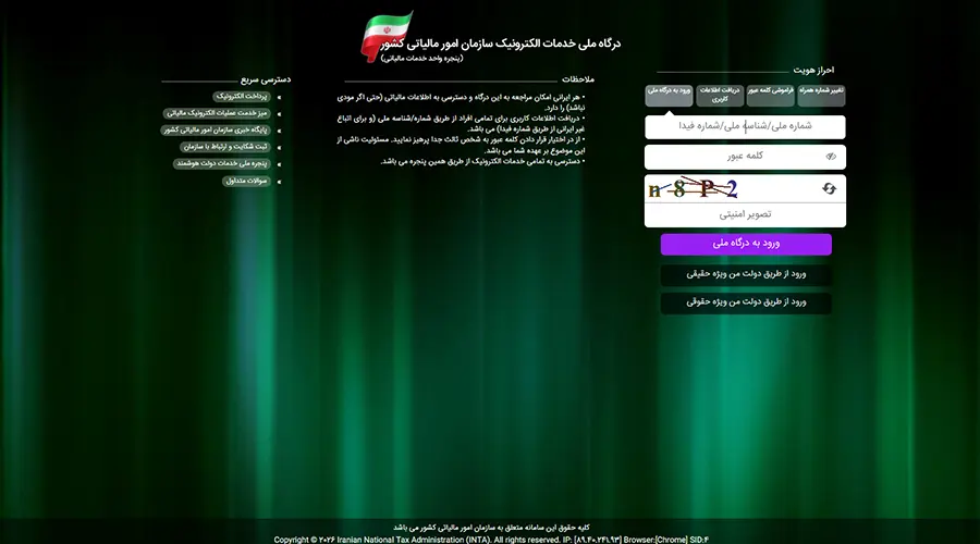 • هر ایرانی امکان مراجعه به این درگاه و دسترسی به اطلاعات مالیاتی (حتی اگر مودی نباشد) را دارد.